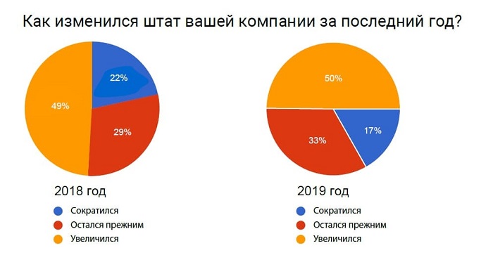 Итоги опроса показали, что изменения в штатах компаний за последний год практически не отличаются от показателей 2018 года. Это говорит о стабильности кадрового рынка: